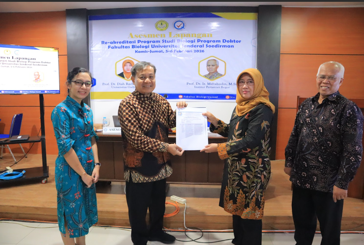 Proses penilaian dilakukan melalui asesmen lapangan pada tanggal 5-6 Februari 2026 yang dihadiri oleh asesor LAMSAMA yaitu Prof. Dr. Diah Rachmawati, S.Si., M.Si dan Prof. Dr. Ir. Miftahudin, M.Si., Wakil rektor bidang Akademik Prof. Dr. Ir. Noor Farid, M.Si., Ketua LPMPP Unsoed Prof. Ir. Juni Sumarmono, M.Sc., Ph.D., IPU., ASEAN Eng., Perwakilan dari LPPM Unsoed, Dekan dan jajaran Pimpinan Fakultas Biologi, Gugus Penjaminan Mutu Fakultas Biologi, Gugus Kendali Mutu Program Studi S3 Biologi, Dosen Program Studi, Mahasiswa, Mitra dan Alumni.