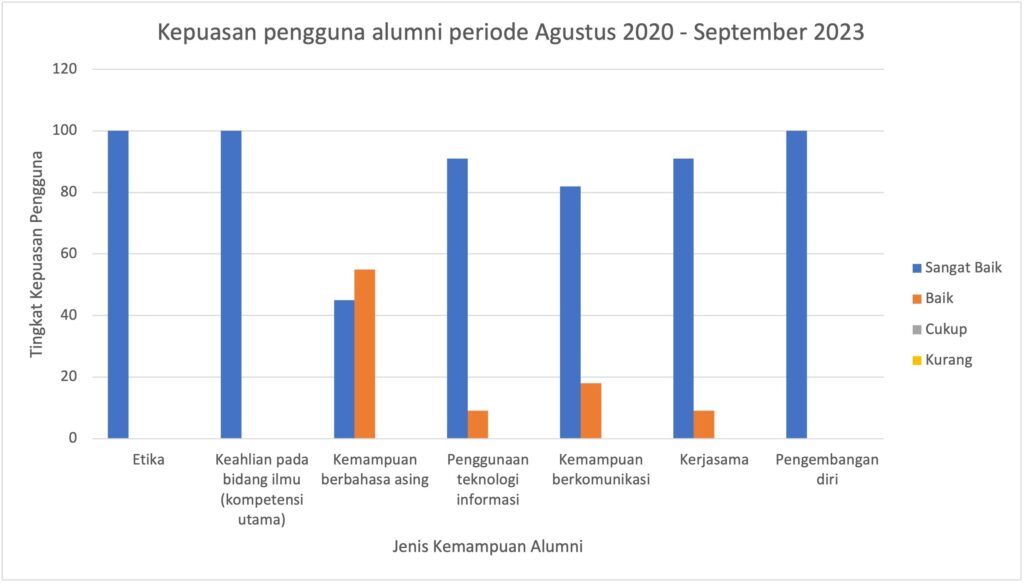Hasil tracer study kepuasan pengguna terhadap alumni Program Studi Biologi Program Doktor, Fakultas Biologi, Universitas Jenderal Soedirman ditampilkan pada grafik berikut berdasarkan data mulai Agustus 2020 s/d September 2023. unduh grafik